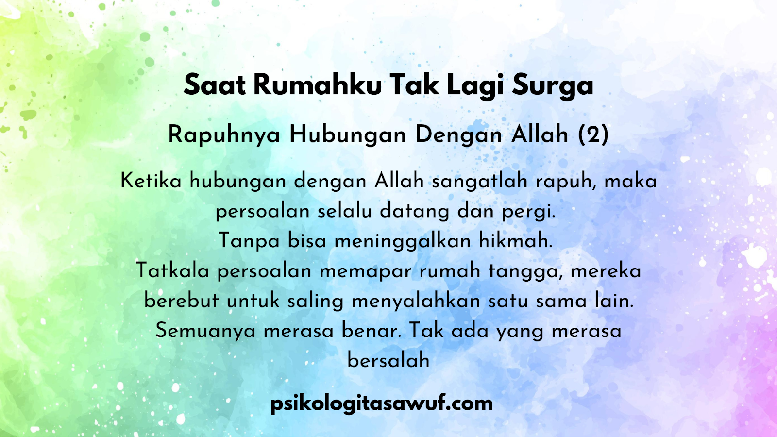 Karena hubungan dengan Allah sangatlah rapuh, maka persoalan selalu datang dan pergi tanpa bisa meninggalkan hikmah. Tatkala persoalan memapar rumah tangga, mereka berebut untuk saling menyalahkan satu sama lain. Semuanya merasa benar. Tak ada yang merasa bersalah.